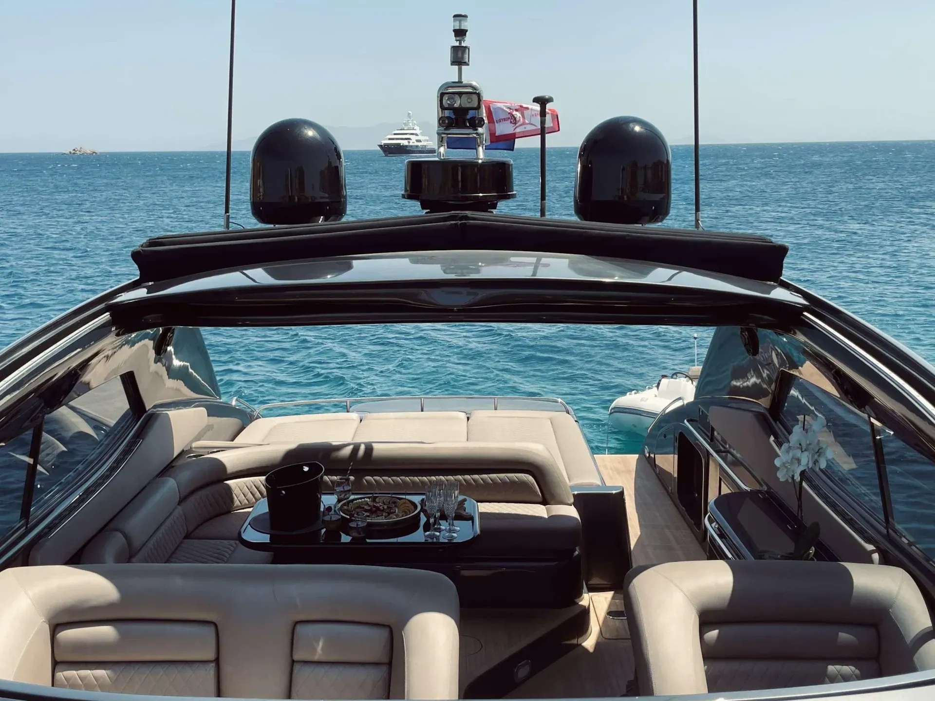 Powered by twin MAN engines, 007 delivers the signature Sunseeker combination of speed and stability, cruising smoothly between Mykonos and neighboring islands such as Paros, Naxos, and Ios.