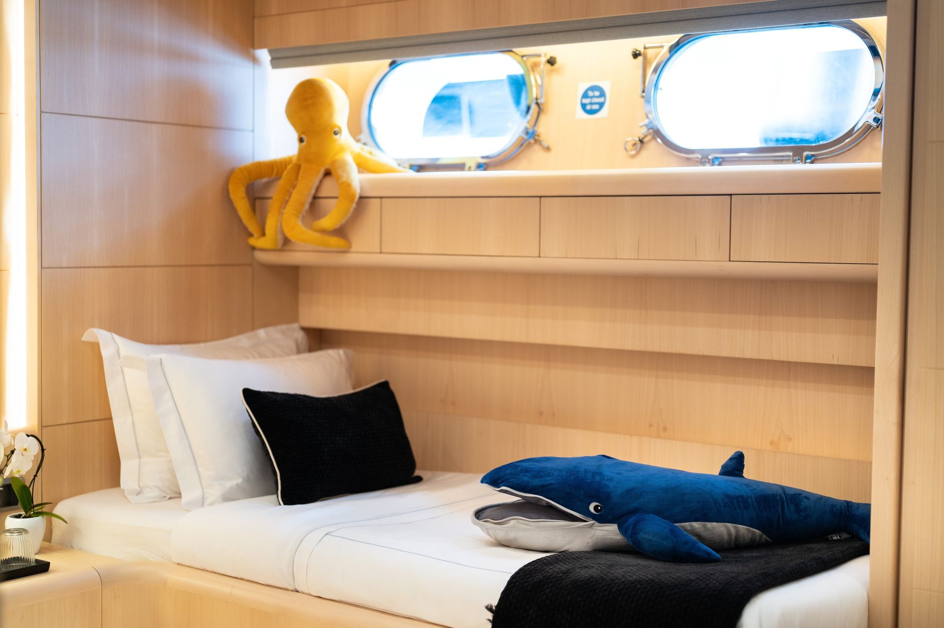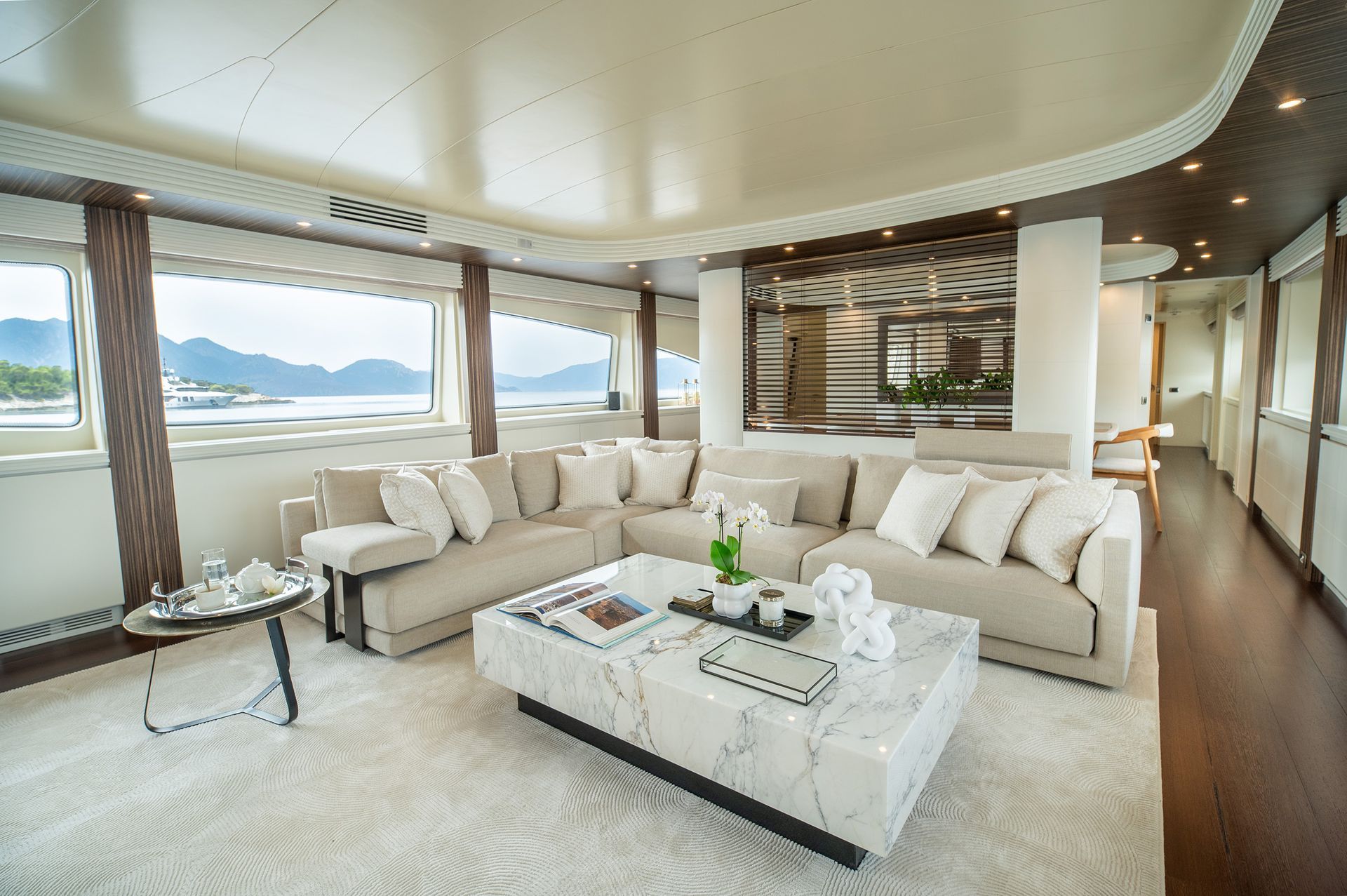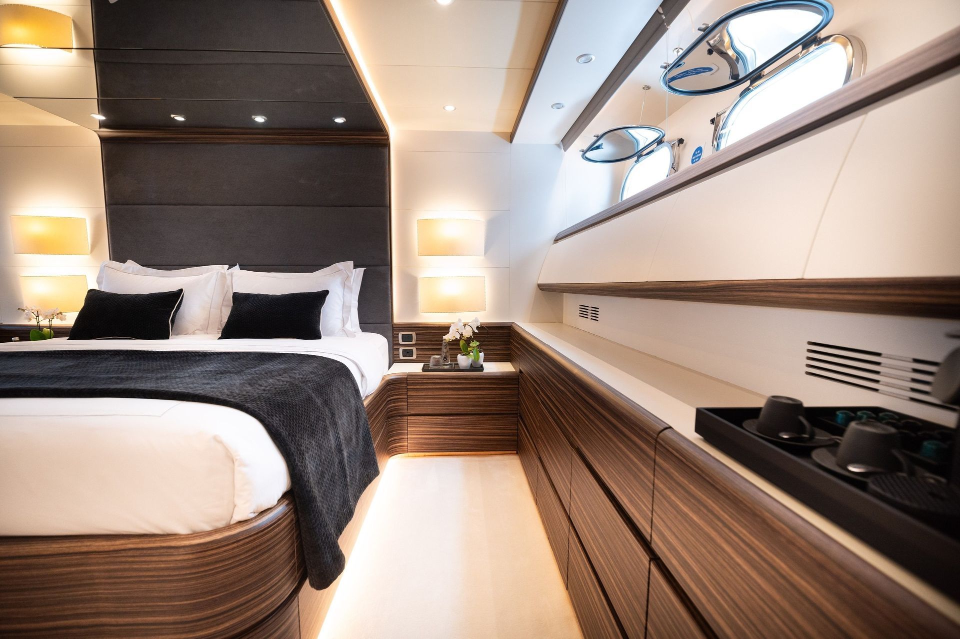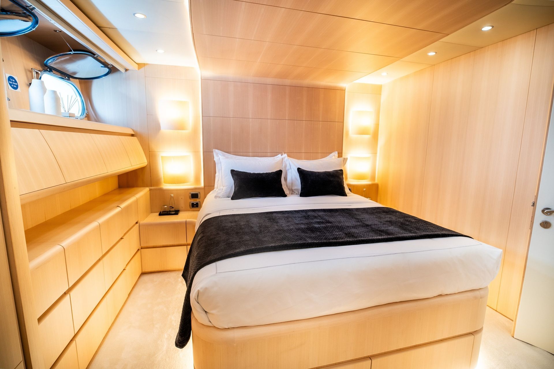 The real gem of the yacht is the flybridge, affectionately known by the crew as “The Lounge.” By day, it's a serene coffee bar complete with jazz music, a generous snack station, jacuzzi surrounded by sun pads, and cozy shaded seating. As the sun sets, the space transforms into a champagne lounge, ideal for pre-dinner gatherings or moonlit relaxation. Whether you're sipping espresso or raising a glass of bubbly, the ambiance is always just right.