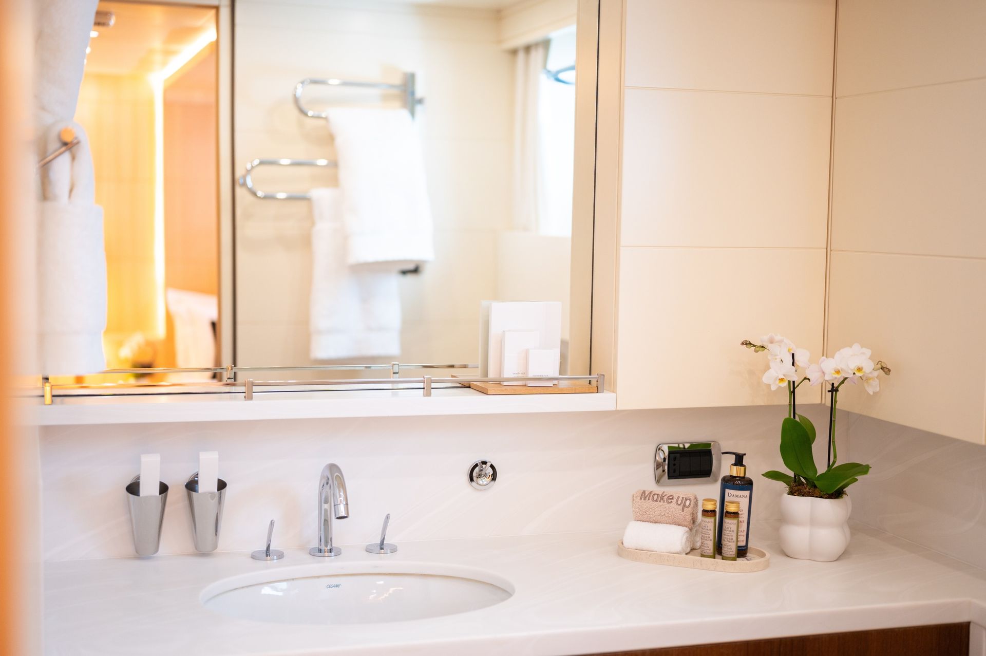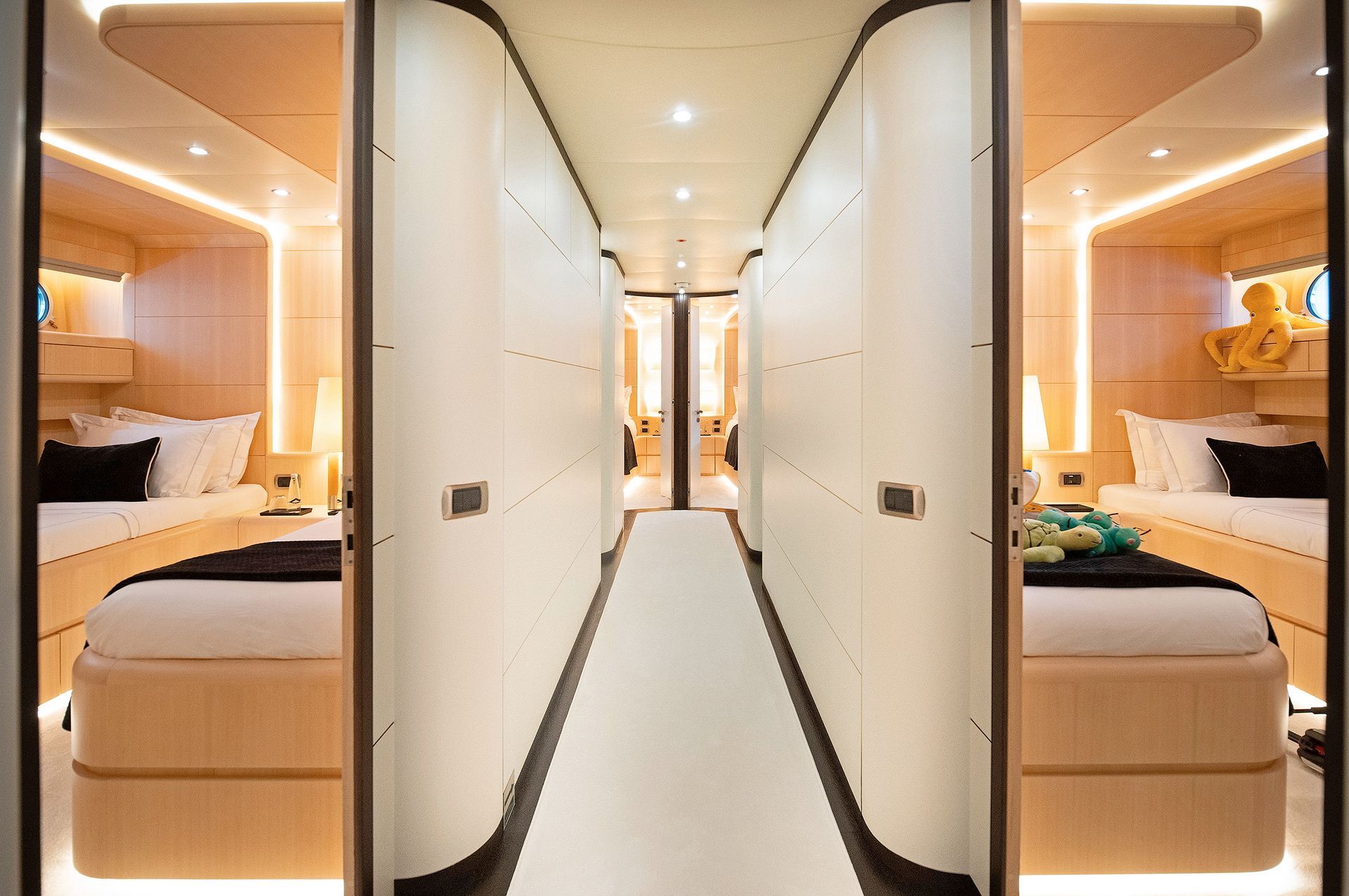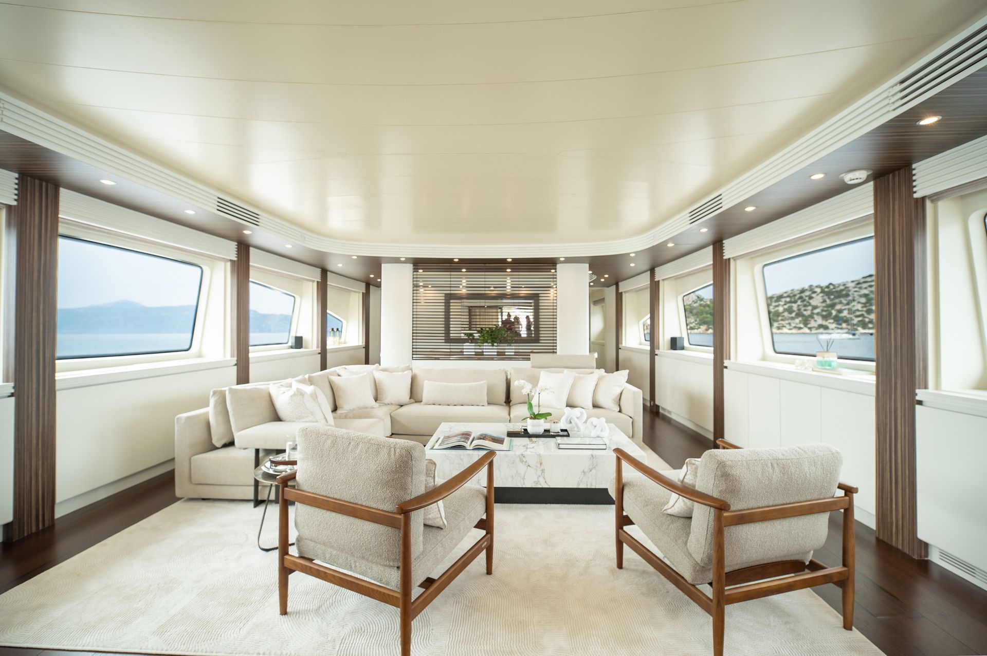 Refitted in 2022, PAREAKI II seamlessly blends classic elegance with fresh contemporary styling. Her interior feels open and refined, featuring high ceilings, plush white carpeting, and a warm ambiance throughout. The yacht sleeps up to 12 guests in 6 beautifully appointed cabins, including a rare single cabin on the main deck, 2 twin cabins (one with a Pullman berth), 2 VIP doubles, and a stunning full-beam Master suite — all with en-suite facilities and full air-conditioning.
