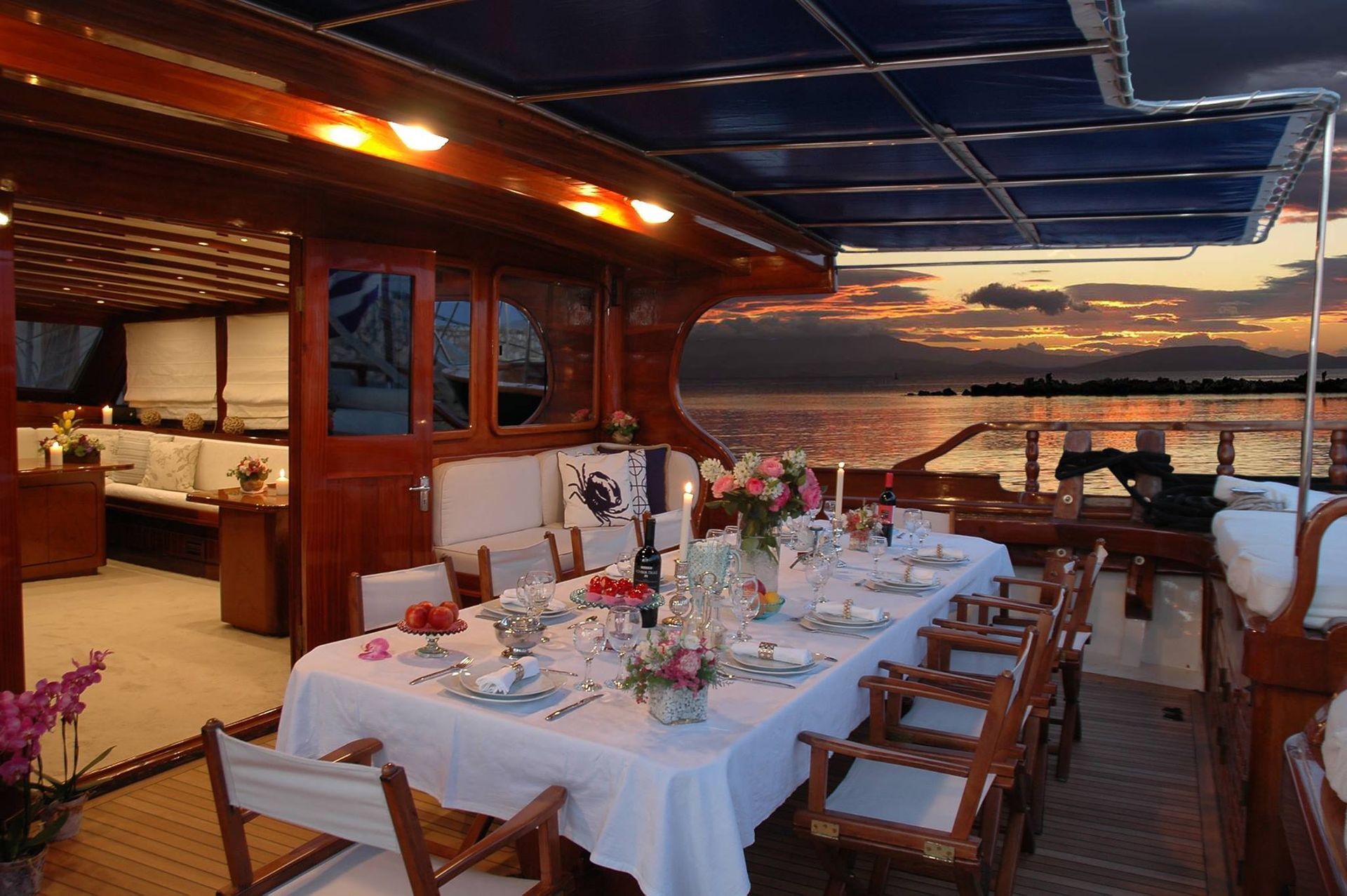 - Large aft dining area with seating for up to 18 guests