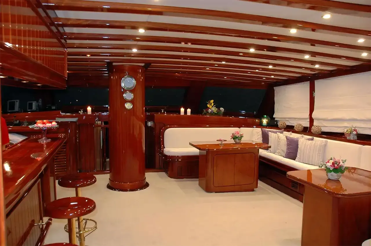 Step aboard M/S Matina, a stunning 38 metre (approx. 125 ft) handcrafted wooden motorsailer, built in 2000 and thoughtfully refitted. With her wide beam of 9.4 metres, she offers exceptional stability and expansive outdoor deck space — perfect for a charter group seeking both elegance and comfort.