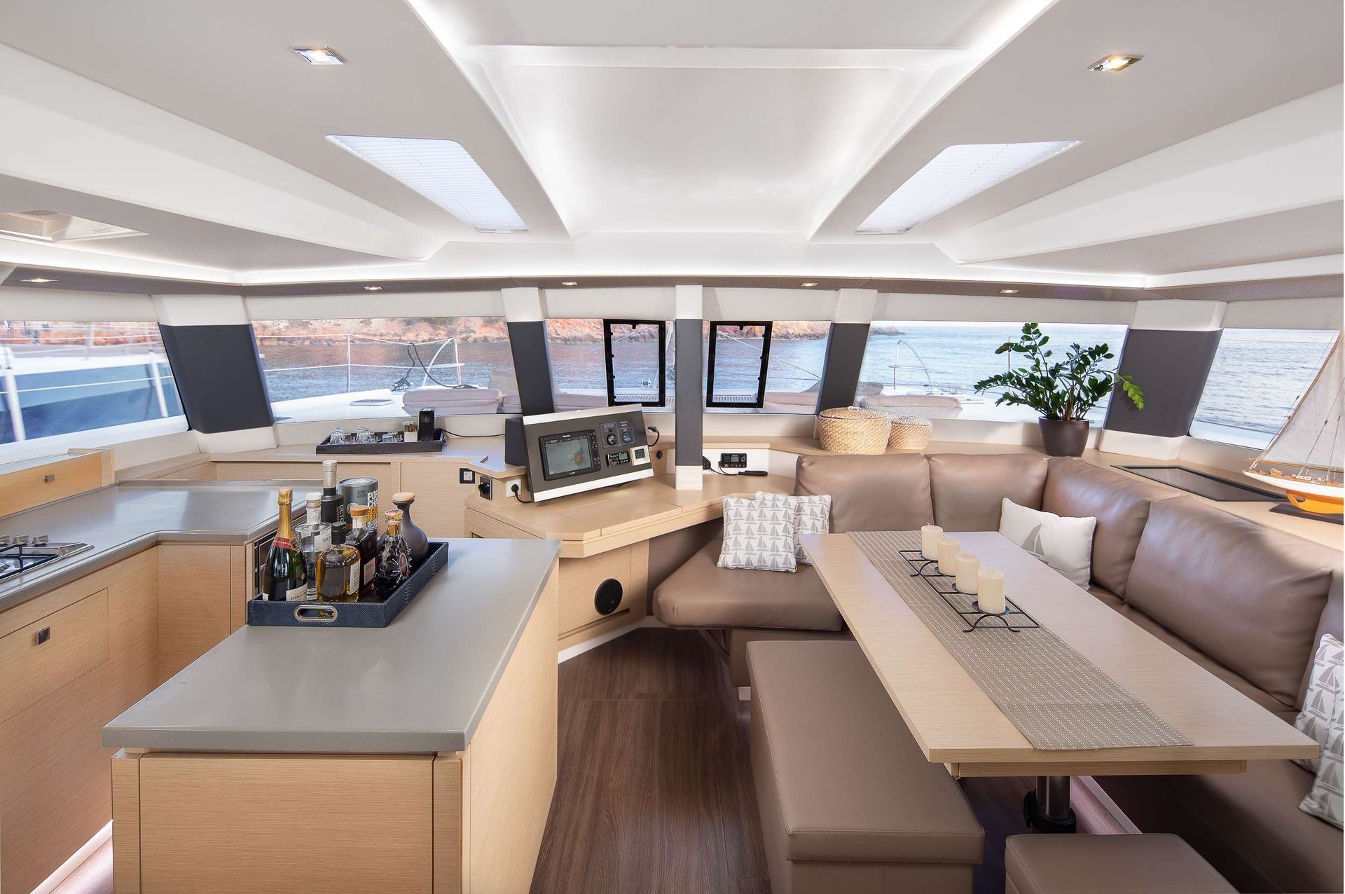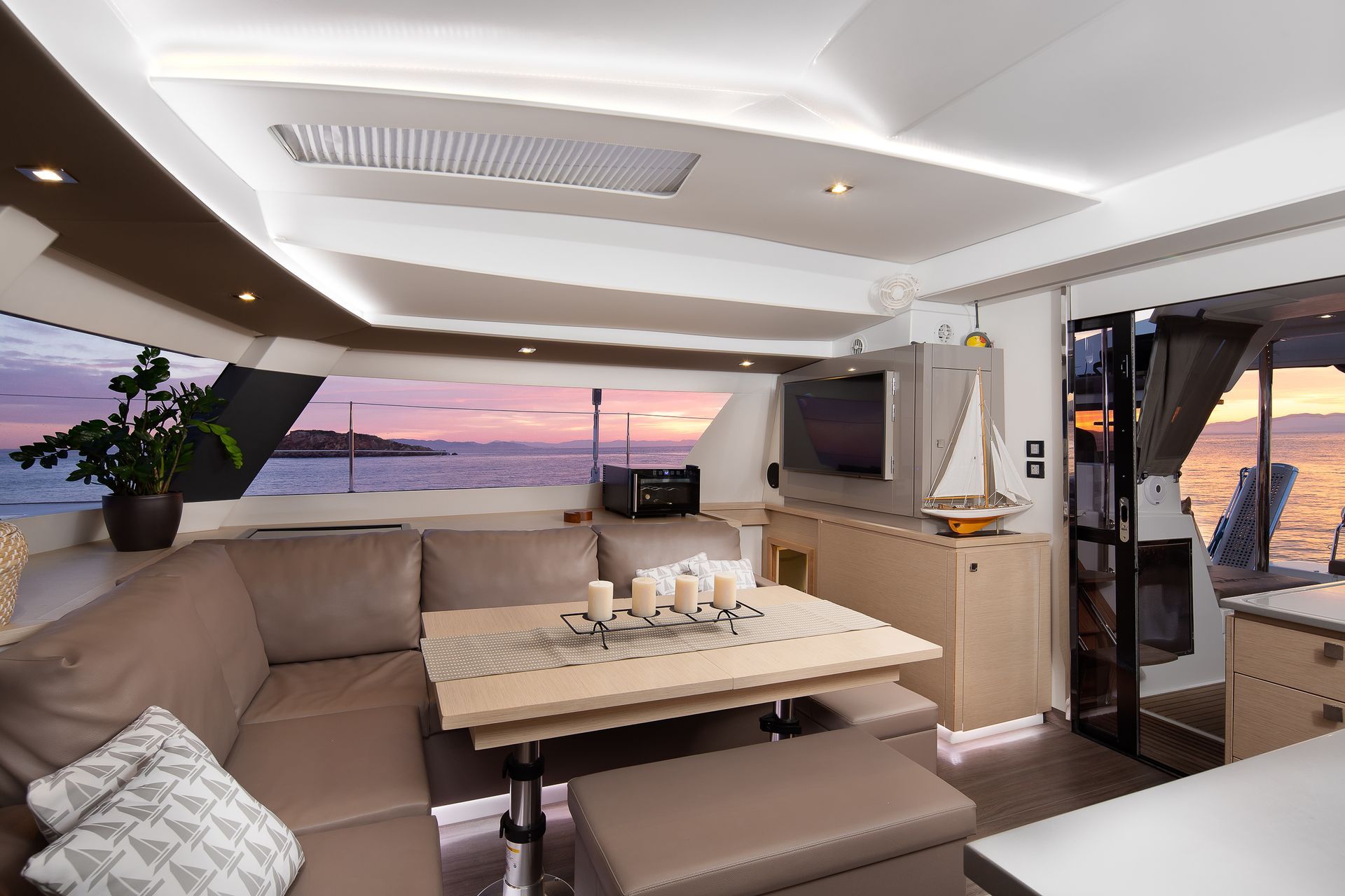 - The yacht features a spacious salon and dining area bathed in natural light, with large windows offering panoramic sea views — perfect for relaxing or enjoying meals in comfort.