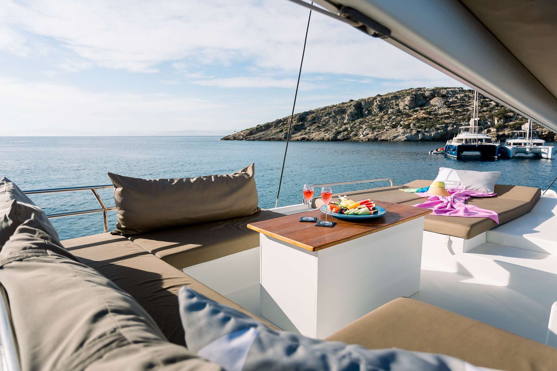 With sleek twin hulls and a modern design, she offers generous indoor and outdoor spaces — ideal for families, groups of friends or couples seeking a refined yachting experience in Greece
